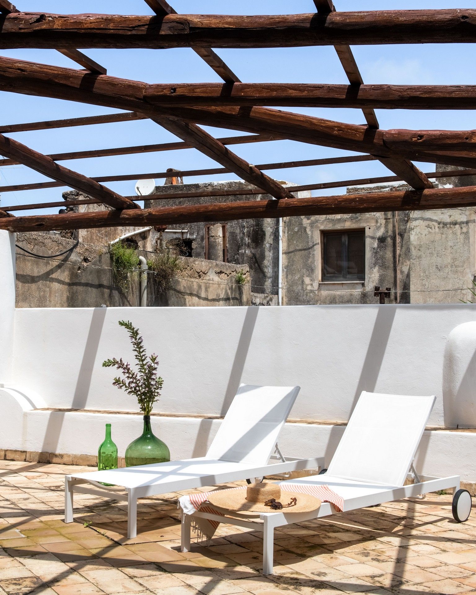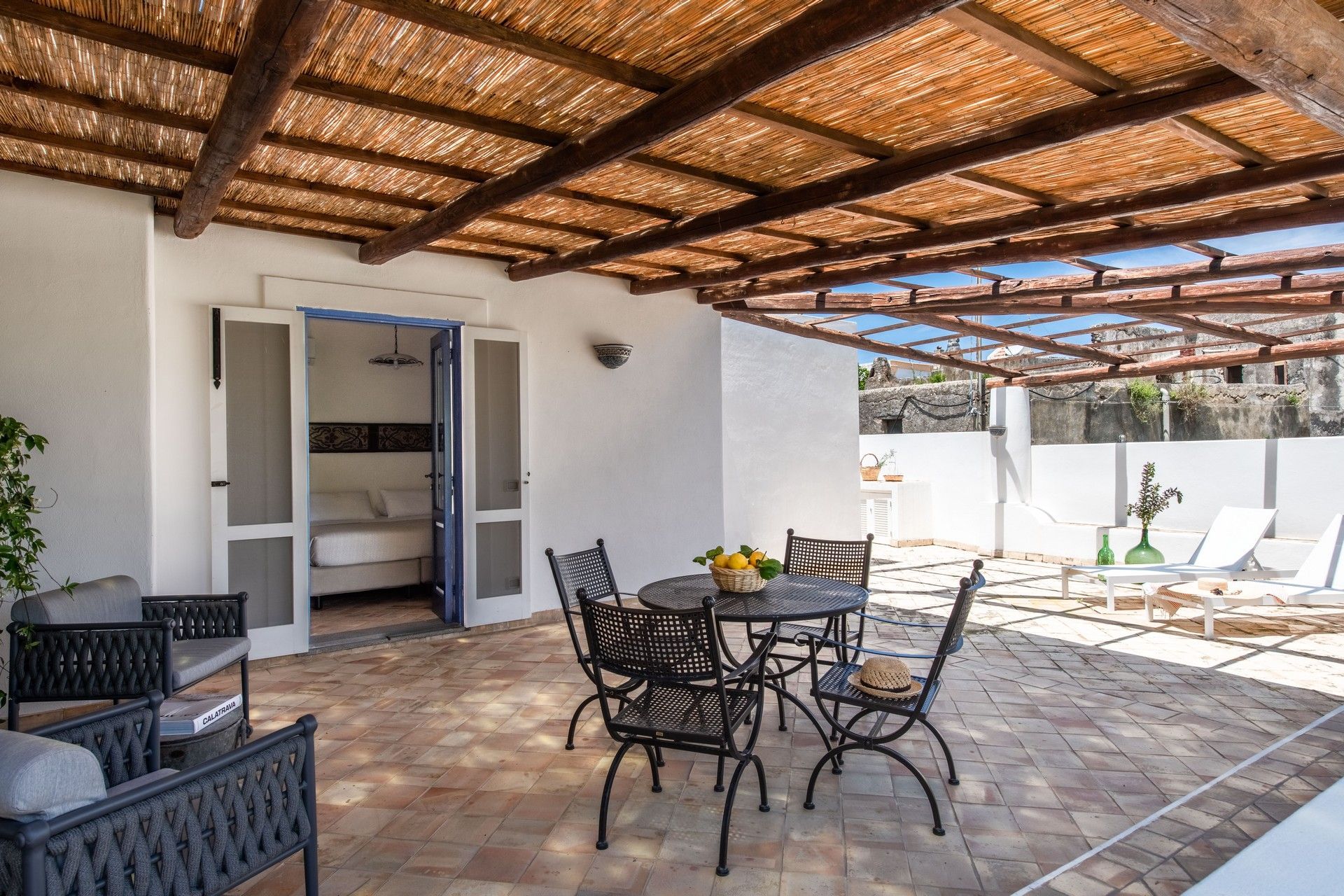Chiara 2 is a double room with a private bathroom and a large terrace at your disposal with an enchanting view of the mountain. It is elegantly furnished with outdoor sofas, dining table, chairs, and sun loungers.